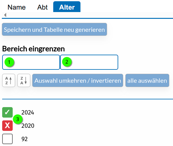 Bei Spalten mit Zahlenwerten können die Zahlenwerte mit einem Bereich von/bis eingegrenzt werden (Nr. 1 und 2 im Bild).