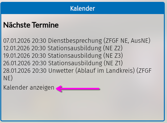 Jeder Anwender hat Zugriff auf die Übungstermine sowie die sonstigen Termine der Feuerwehr. Voraussetzung für die Nutzung der Funktion ist, dass die Übungen der jeweiligen Abteilung im Übungssystem vorab gelegt werden. Die Übungstermine werden dann durch das System in den persönlichen Kalender übertragen. Termine, die keine Übungen sind, können direkt im Kalender erfasst werden. Für die Zuordnung ist die erfasste Personengruppe relevant (z. B. 1. Zug/Gruppe, Atemschutzgeräteträger usw.).