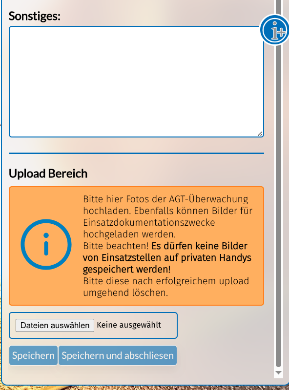 Im Register "Bericht" können im unteren Bereich zusätzlich weitere Informationen erfasst werden, falls dies nötig ist. Das können allgemeine Notizen zur Übung sein. Unterhalb können noch Dokumente und Fotos hochgeladen werden. Dies betrifft Fotos der Atemschutzüberwachung und der Übung an sich. Schließlich kann der Vorgang mit einem Klick auf den linken Button ("Speichern") abgeschlossen werden.